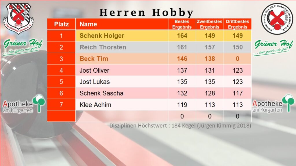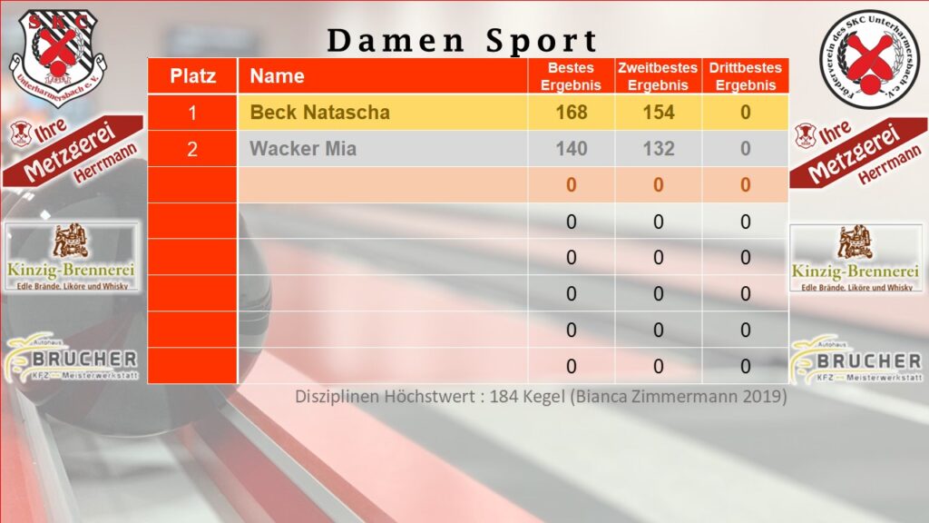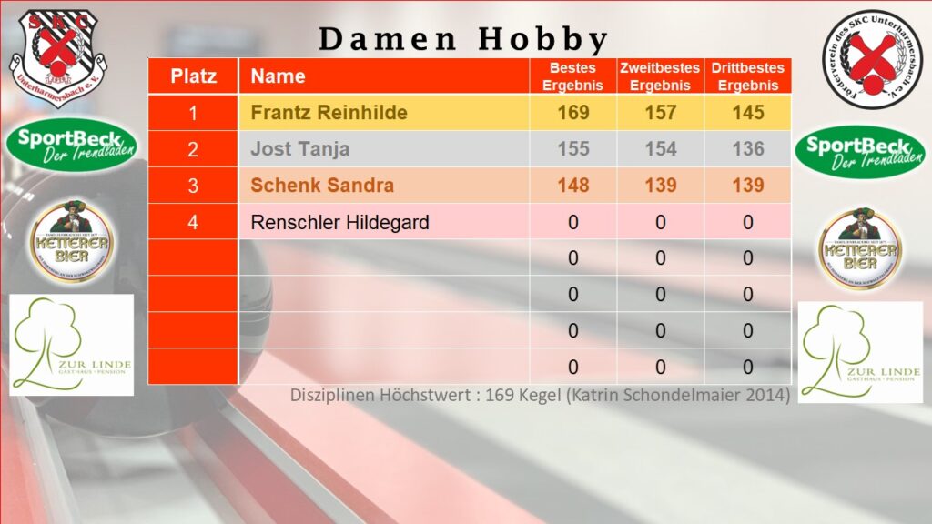 Bei den Damen Hobby führt Reinhilde Frantz, welche den Rekord von Katrin Schondelmaier aus 2014 mit 169 Kegel eingestellt hat.