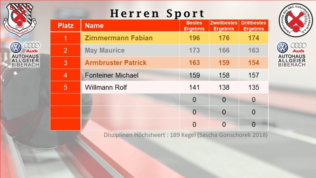 Gleich zu Beginn haut Fabian Zimmermann am ersten Wettkampftag mächtig einen raus und überbietet den alten Rekord von Sascha Gonschorek von 189 Kegel aus dem Jahr 2018 um 7 Kegel und führt aktuell mit 196 Kegel natürlich die Herren Sport an.