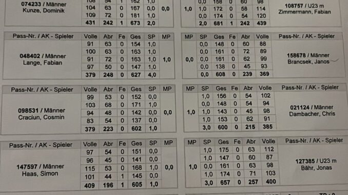 Fabi (681) und Jonas (657) haben heute gespielt und die Punkte geholt. Dambi (600) stolpert auch zum Punkt. Der Rest war als Weinachtsmann unterwegs. Gonschi seine Performance beim Fahren ware unübertroffen.