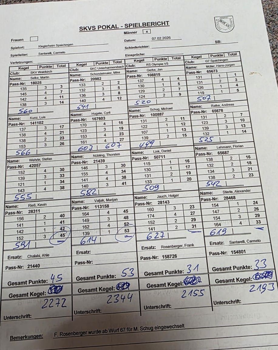 In der Gesamtwertung erreichte der SKC Unterharmersbach 50 Punkte bei 2290 Kegeln. Der SKV Waldkirch kam ebenfalls auf 50 Punkte und 2281 Kegel, während der KSC Immendingen mit 45 Punkten und 2126 Kegeln folgte.