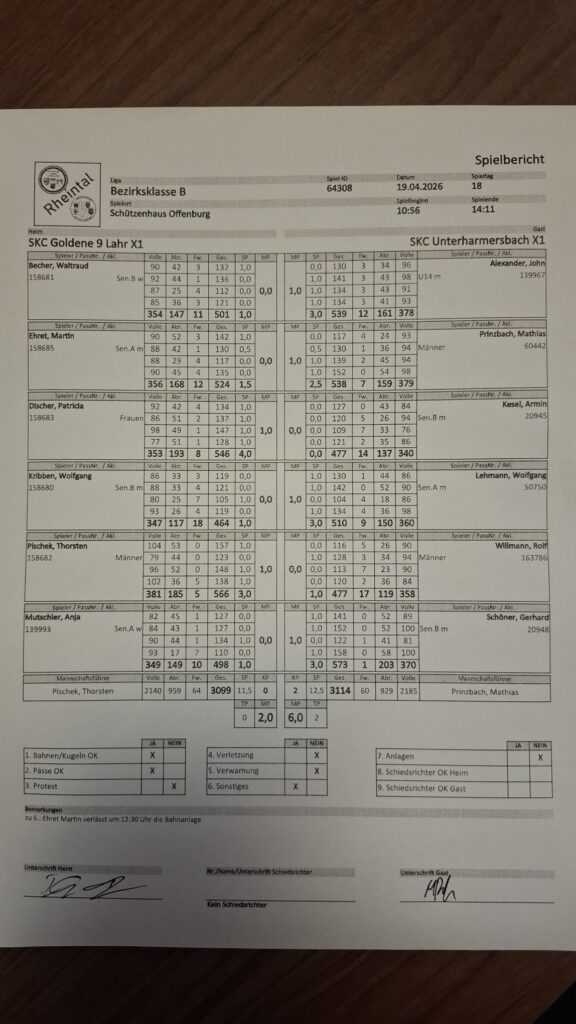 Am Schluss spitze sich dann Spiel immer mehr zu, da die Goldene 9 Lahr aufholte und vor dem letzten Abräumen gar mit 26 Kegel in Führung ging. Hier hatten jedoch Gerhard mit starken 573 Kegel und dem vierten Punkt sowie Rolf (477 Kegel) das letzte Wort und sicherten den knappen Sieg und somit noch den Vierten Tabellenplatz.