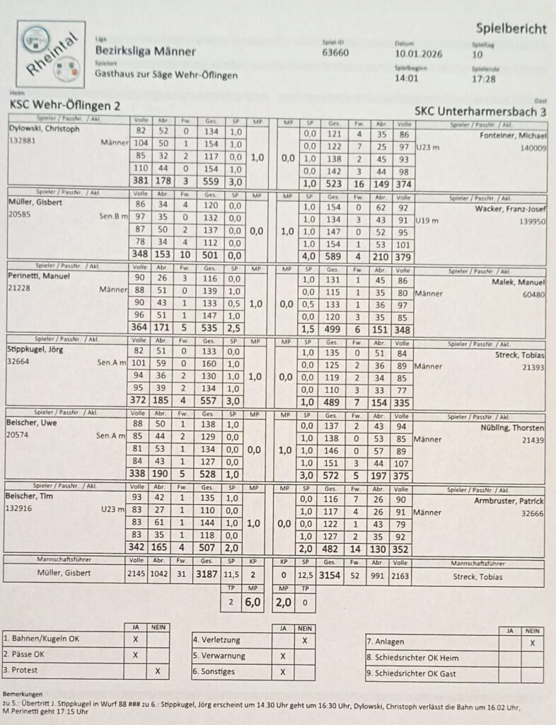Als 5. Spieler spielte Thorsten Nübling 572 Kegel er verkürzte den Abstand für den SKC und Uwe Beischer mit 528 Kegel. Als 6. Spieler spielte Patrick Armbruster 482 Kegel er gab noch einige Kegel ab gegen Tim Beischer mit 507 Kegel zum Sieg für Wehr-Öflingen.