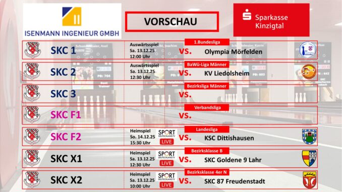 Der SKC Unterharmersbach steht vor einem spannenden Jahresabschluss-Wochenende: Die Bundesliga-Männer greifen beim Topspiel in Mörfelden nach der Herbstmeisterschaft, während die zweite Mannschaft in der BaWü-Liga beim heimstarken KV Liedolsheim vor einer schweren Auswärtsaufgabe steht. In der Frauen-Landesliga steigt das direkte Duell um die Tabellenführung gegen Dittishausen. Die Gemischte 1 trifft im Kellerduell der Bezirksklasse B auf den SKC Goldene 9 Lahr, und das 4er-Team bekommt es zudem mit dem verlustpunktfreien Tabellenführer Freudenstadt zu tun.
